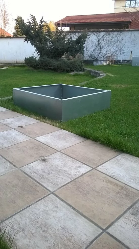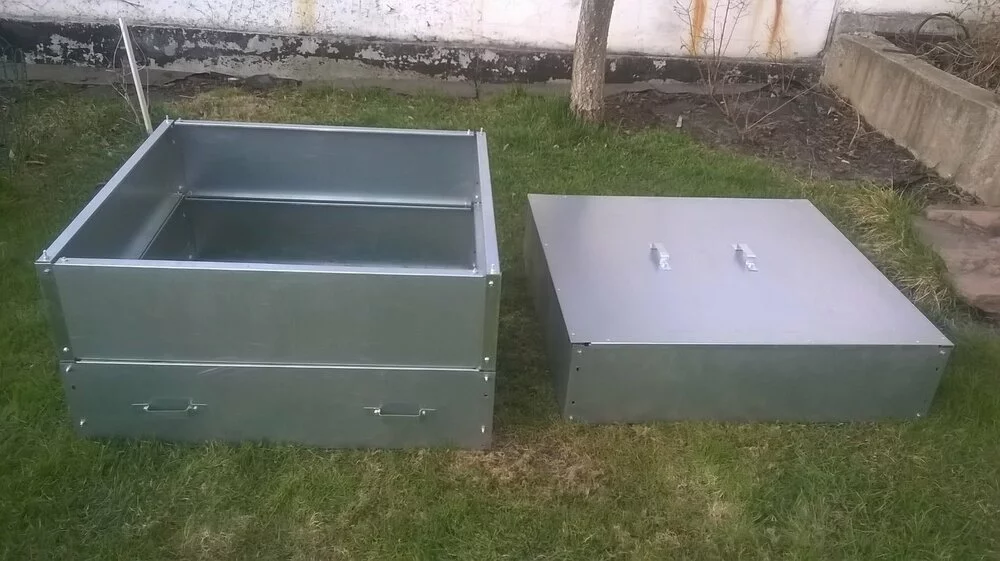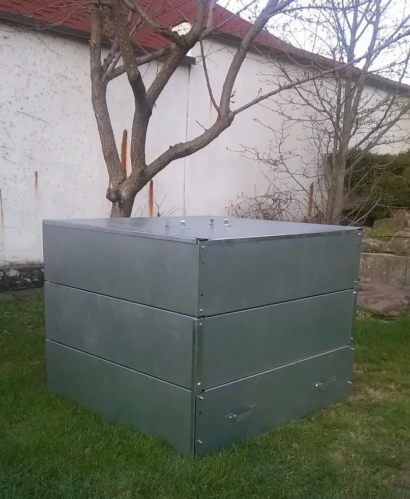 Садовий компостер з оцинкованої сталі, складений з прямокутних панелей, які скріплюються між собою болтовим з'єднанням. Зверху може накриватися кришкою - цільної або складається з 2, 3 частин.