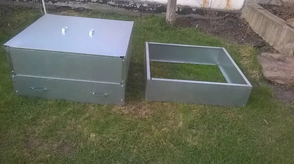 Базові габарити 760х1000х930 з товщиною стінки 0,55, 0,7 або 1 мм. На двох передніх панелях посилений металевими куточками, нижня панель для вигребкі компосту легко знімається. Вага всієї конструкції - 38 кг.