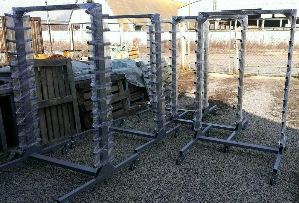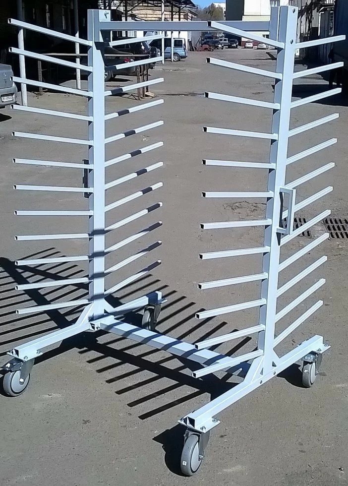 Пропонуємо консольні стелажі для зберігання довгомірних матеріалів. В даному випадку представлені стелажі для зберігання паркетної дошки. Виготовлені з профільної труби 80х40х2, 40х20х2, ВГП труби Ду 15. Оснащені надійними поворотними опорними колесами.