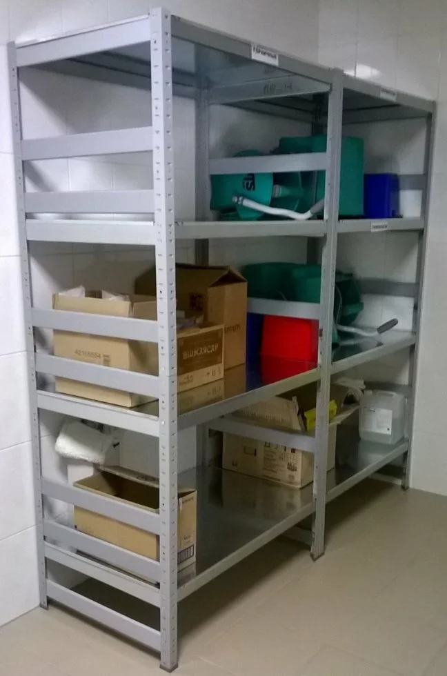 Універсальний поличний стелаж виготовляється з оцинкованої сталі або холоднокатаної сталі з полімерним порошковим покриттям. Основні використовувані кольори - білий (RAL-9016) і сірий (RAL-7040). Каркаси стелажа робимо зі сталі товщиною 0,8; 1,0; 1,2 і 1,5 мм, полки - зі сталі товщиною 0,63; 0,8; 1,0; 1,2 та 1,5 мм.