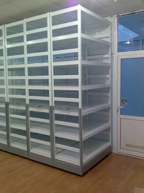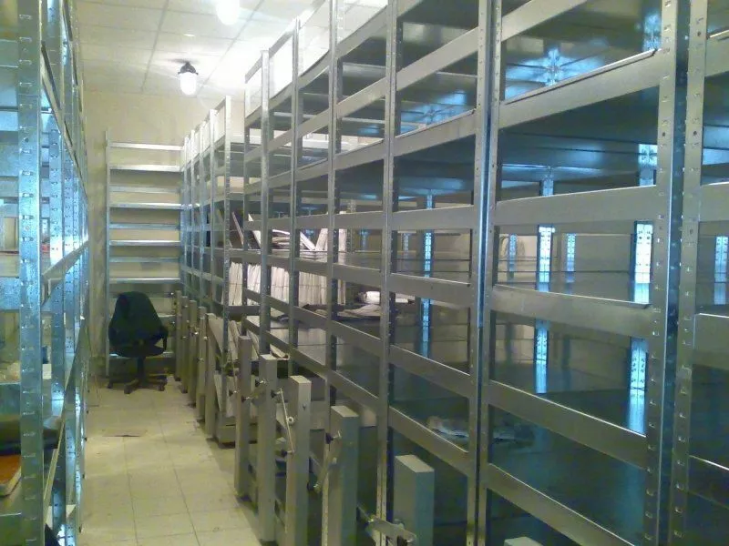 Металлические стеллажи применяются на складах и в архивах. Изготовляются из высококачественного оцинкованного металла. Передвижные складские стеллажи позволяют разместить аналогичный объем материалов на меньшей приблизительно в 2 раза площади и достигнуть существенной экономии стройматериалов, расходов на сигнализацию, систему вентиляции и т.д.